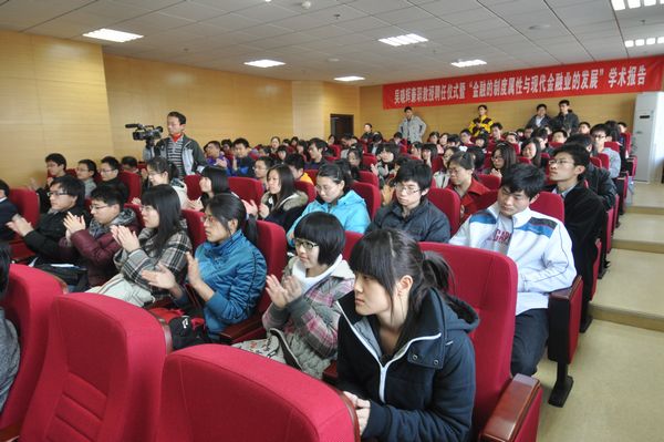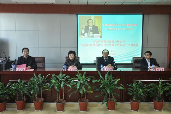仪式后,吴晓辉行长做客2011年第1期“山东省应用金融理论与政策研究基地金融家论坛”,发表了题为“金融的制度属性与现代金融业的发展”的学术报告。报告中,吴晓辉行长从金融的概念、金融业的历史发展、金融企业与金融市场、金融业的监管、21世纪现代金融业发展趋势和现代金融研究的发展趋势六个方面做了详细阐述。他首先从金融的概念与金融业的历史发展着手,解释了金融的概念分类及金融业的飞速发展状况,重点分析了目前金融企业与金融市场的发展,金融企业可以从业务、收入、考评、风险四个角度进行分类,由此构成的金融市场具有融资功能、投资功能、价格发现、风险对冲四个主要功能。而政府对于金融业的监管主要通过拨备来消化预期损失、通过资本缓释非预期损失冲击 、宏观调控三方面。他提到21世纪现代金融以基于脱媒基础上的银行功能重构、基于环境变化基础上需求创造供给、基于信息技术基础上的经营模式革命为主要趋势发展,关于现代金融发展研究的方法也顺应金融发展趋势,从个体孤立演变到整体联系(行业、产业链、上下游,相关性),最终以立体发展(加入了时间因素)的方法为主。学术报告由经济学院常务副院长胡金焱教授主持,并对学术报告做了生动诠释和精彩点评。