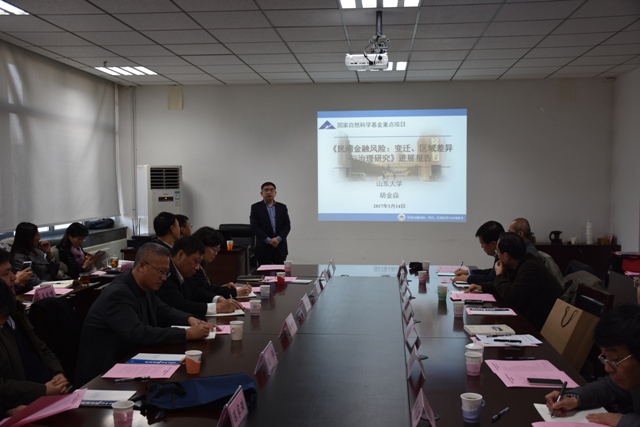 2017年1月14日下午,经济学院胡金焱教授主持承担的国家自然科学基金重点项目“民间金融风险:变迁、区域差异与治理研究”和国家自然科学基金面上项目“小额贷款公司系统性风险的评估与度量研究”进展报告会在知新楼B321举行。山东省政府辛树人副秘书长、山东省证监局陈家琰局长、山东省科技厅于书良副厅长、山东省金融工作办公室张伟副主任、山东省银监局刘悦芹副局长、中国人民银行济南分行刘健副行长、山东省土地综合整治服务中心李峰主任、山东省小额贷款企业协会姜明文秘书长、山东省科技厅基础研究与科技条件处陈成刚处长、中国人民银行济南分行金融研究处李菡副处长、中国人民银行济南分行调查统计处代金奎副处长、山东金融资产交易中心李文峰董事长、山东舜德数据工程有限公司田茂圣董事长、山东省宏观金融研究院刘保麟秘书长、齐鲁工业大学金融学院徐如志院长等金融界领导和专家应邀出席了会议,项目负责人胡金焱教授、人文社科研究院院长邢占军教授、《山东大学学报(哲学与社会科学版)》主编魏建教授、山东大学科学技术研究院平台与成果管理办公室傅茂笋主任、经济学院院长李长英教授、经济学院党委副书记李维林副教授以及课题组专家参加了报告会,报告会由课题组成员、经济学院金融系主任徐涛教授主持。